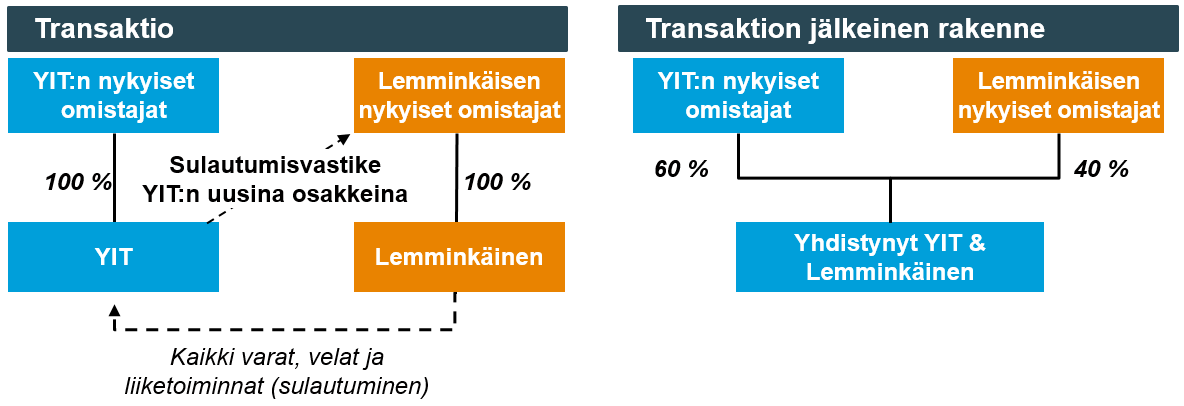Yhdistyminen toteutettiin absorptiosulautumisena, jossa Lemminkäinen sulautui YIT:hen.