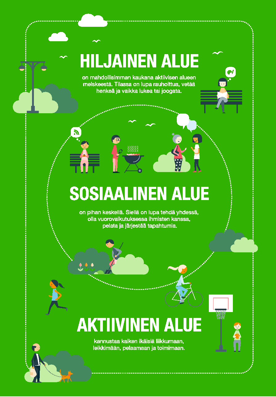 Viihtyisä piha syntyy ottamalla käyttäjät mukaan suunnitteluun: osa pihasta tehdään valmiiksi, osan suunnitteluun pihan käyttäjät osallistuvat ja pitävät sen elossa, joten piha on ajassa muuntautuva eikä koskaan valmis.